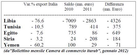 A conferma segnalo alcuni dati recenti riguardanti gli scambi fra Italia e i 5 Paesi arabi in crisi, elaborati dalla Camera di commercio italo araba (su base Istat) e relativi al periodo gennaio-settembre 2010-2011.