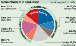 Crescono Dimar (Socialisti) al 6%, Syriza (Socialisti di sinistra) al 15,5% e KKE (Comunisti) al 8,3%, che se si coailizzassero, (ipotesi purtoppo al momento remota a causa delle divisioni a sinistra) rappresenterebbero circa il 30%. Entrano in Parlamento anche i neonazisti di Alba dorata, con il 6,8%.
