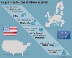 Il 14 giugno, i membri dell’Unione Europea hanno dato ufficialmente alla Commissione Europea il mandato di negoziare l’accordo di libero scambio con gli Stati Uniti. Le parti vogliono concludere i negoziati entro la fine del 2014. Gli Stati Uniti e l’UE hanno già una relazione economica piuttosto robusta. Sono le due più grandi economie del mondo; costituiscono il 40% della produzione economica mondiale; hanno le più grandi relazioni economiche bilaterali del mondo, il che rappresenta circa il 33% del commercio mondiale, e gli Stati Uniti sono la più grande fonte e destinazione degli investimenti diretti esteri dell’Unione Europea.