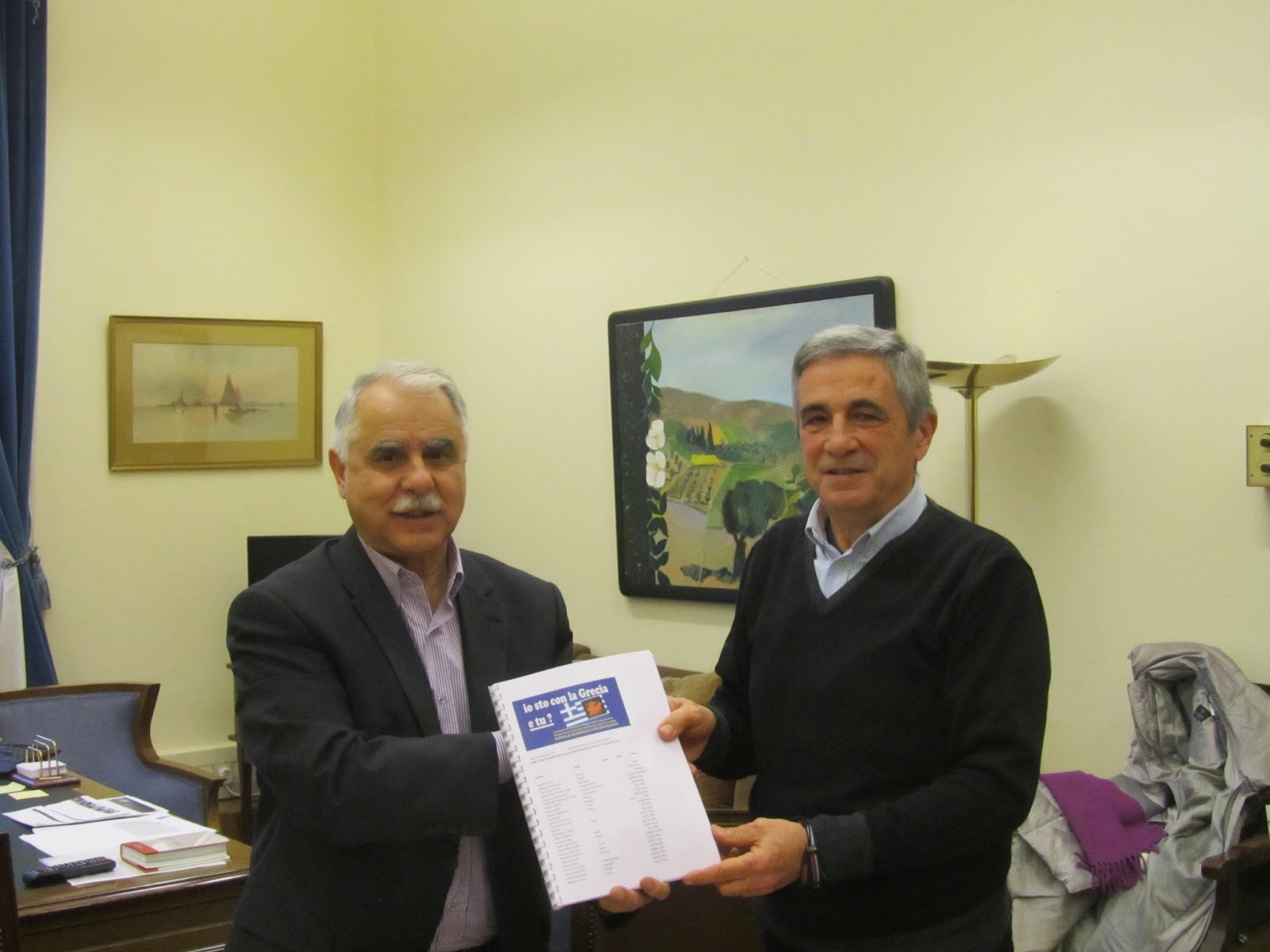 “Io sto con la Grecia e tu?” Consegnate le oltre 5000 firme raccolte in 5 giorni da Cambiailmondo e FIEI, al governo greco nelle mani del vice Presidente del Parlamento greco, Yannis Balafa.