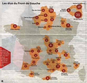 Ciò che non emerge dalla comunicazione dei media mainstream europei e nazionali è il fatto che dopo il secondo turno delle elezioni dipartimentali, il Fronte di Sinistra ha eletto 176 consiglieri provinciali, di cui 167 del PCF o ad esso legati.