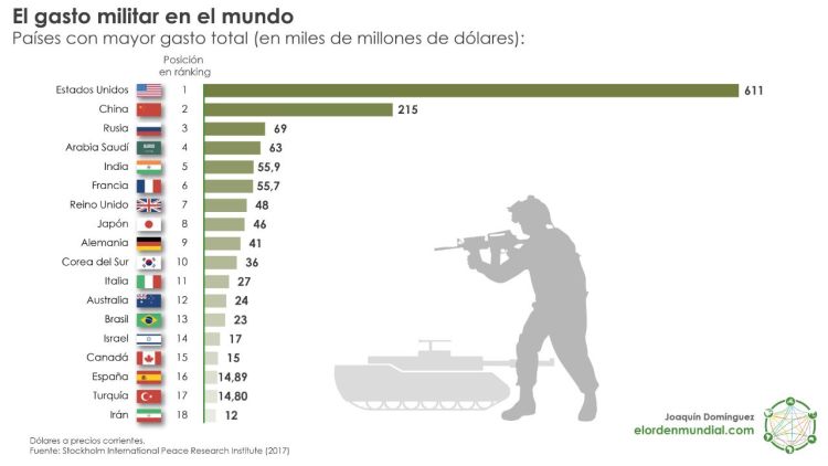 L’Arabia Saudita nonostante i rilevanti problemi di bilancio pubblico (già affrontati sulle pagine di questo giornale – http://www.pisorno.it/arabia-saudita-fra-crisi-di-bilancio-repressione-interna-e-riposizionamento-regionale-lesecuzione-di-al-nimri-leva-della-nuova-strategia-saudit) ha incrementato notevolmente le proprie spese militari negli ultimi anni: come riportato dal Sipri (Stockholm International Peace Research Institute) nel 2017 si è posizionata al 4° posto nella graduatoria mondiale per gli acquisti di armamenti con la ragguardevole cifra di ben 62 miliardi di dollari, ormai ad un passo dalla Russia (69 mld $). Un incremento di spesa che vede in prima fila i paesi dell’Ue che dal 2012 “hanno moltiplicato il business militare verso l’Arabia Saudita, che da tre anni è il secondo importatore di armi al mondo dopo l’India, con un incremento del 212% tra il 2012 e il 2016 rispetto ai cinque anni precedenti”.