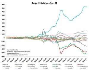 Il grafico permette di capire il flusso di denaro che esce, per esempio dall’Italia, e che finisce in Germania, dimostrandone l’eccesso (gli eccedenti di 900 miliardi), o il forte deficit di bilancia del nostro paese (-230 miliardi). Insieme alla Spagna (-350) e l’Irlanda (-450) quasi tutto verso la Germania.