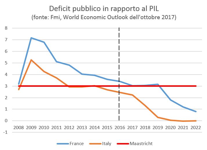 Come vedete i francesi (les bleus) sono sempre stati sopra a noi, e sempre oltre il parametro di Maastricht (in rosso), e lo saranno almeno fino al 2019, con in più il fatto che il divario fra loro e noi è destinato ad aumentare (a indicare che noi saremo, secondo il Fmi, sempre più virtuosi di loro, oltre a essere di fatto in regola con Maastricht già da sei anni: sei anni di sacrifici che l’Europa ci riconosce così, sberteggiandoci!).
