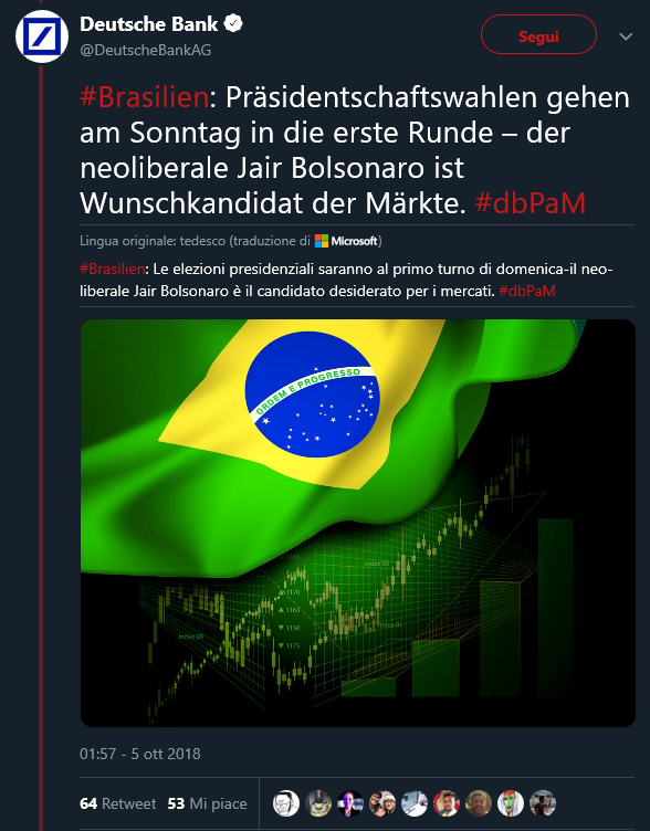 Non è un caso se di fronte alla vittoria di Jair Bolsonaro in Brasile i festeggiamenti — e i silenzi —riguardino tanto i liberal di Destra quanto quelli di Sinistra che internamente si contendono il predominio politico. Bolsonaro vuole spezzare le reni allo Stato sociale, eliminare ogni forma di assistenzialismo verso i poveri e i bisognosi, premere con le privatizzazioni, favorire i mercati (che plaudono a Bolsonaro), svendere l’ambiente affiancando a ciò una retorica ultraconservatrice e reazionaria. Quando si tratta di accrescere la propria presa, i mercati sono pronti a chiudere gli occhi di fronte ai diritti di donne, minoranze sessuali ed etniche.
