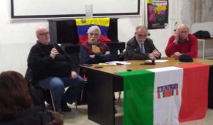 Infine rispondendo a domande dei militanti dell’Anpi, Vasapollo ha lanciato un appello all’unità di tutti i movimenti, non solo i rivoluzionari ma di tutti gli uomini di buona volontà, di tutte le associazioni e di tutte le strutture democratiche progressiste per aiutare il Venezuela perché la battaglia e la guerra contro questo Stato non mette in discussione solo la democrazia in Venezuela ma rappresenta un’ulteriore resa dei conti da parte dell’imperialismo contro i processi di auto-determinazione dei popoli”.