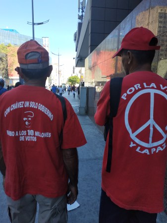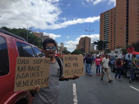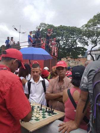 Un mare di magliette e berretti rossi. Giovani di… tutte le età hanno sfilato in una manifestazione chilometrica sotto il sole; a percorrerla tutta dal fondo alla cima, ci si rendeva conto della pacifica allegra fermezza del popolo bolivariano. Invincibile, probabilmente. «Ecco il popolo di Chávez, che non è morto ma è diventato milioni» diceva una donna, mentre un attivista con gli occhiali truccati da occhi di Chávez reggeva un cartello «L’Onu fermi l’aggressione al Venezuela».