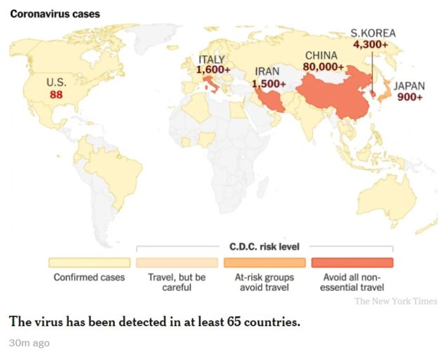 - E’ un fatto che i poli del contagio siano tre: gli estremi della Via della Seta e il suo asse centrale. Anche se la Via della Seta è ancora un progetto. Lo rileva una cartina del NYT. I casi registrati in Iran, in rapporto alle morti già avvenute, dovrebbe essere molto più alto di quello indicato dalle autorità della Repubblica islamica. Se la mortalità si situa intorno al 2%, potrebbero essere 10 volte di più.
