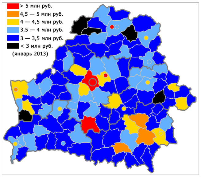 I salari nominali mensili maturati nelle raions (province) bielorusse nel gennaio 2013