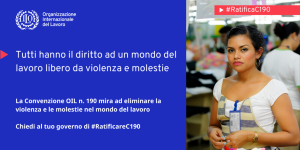 Finalmente è tolleranza zero verso violenza e molestie di genere al lavoro: l’Italia è il primo paese europeo ad avere ratificato la Convenzione 190 dell’Ilo (Organizzazione Internazionale del Lavoro) sull’eliminazione della violenza e delle molestie nel mondo del lavoro, adottata a Ginevra nel 2019 in occasione del centenario dell’Organizzazione.