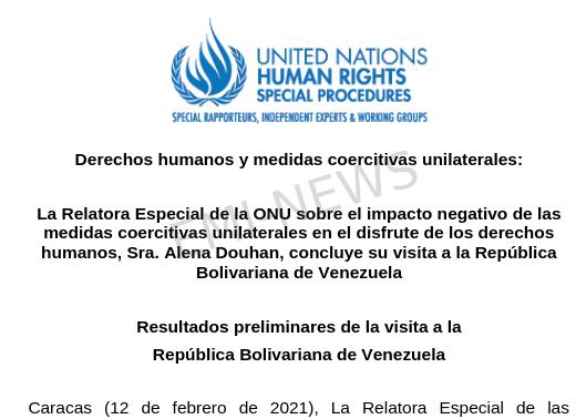Caracas (12 de febrero de 2021), La Relatora Especial de las Naciones Unidas sobre el impacto negativo de las medidas coercitivas unilaterales en el disfrute de los derechos humanos, Sra. Alena Douhan, visitó la República Bolivariana de Venezuela del 1 al 12 de febrero de 2021. La Relatora agradece al Gobierno de la República Bolivariana de Venezuela por permitir y apoyar su visita al país. El propósito de la visita fue evaluar el impacto de las sanciones unilaterales en el disfrute de los derechos humanos de las personas que viven en Venezuela y cualquier otra persona afectada.