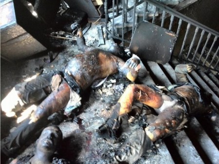 Le persone rifugiatesi dietro le porte del piano terra furono attaccate dai criminali del “Settore Destra” che erano lì dentro da molto tempo prima che l’esecuzione iniziasse. Quelle persone furono arse fino alle ossa, prima all’ingresso principale…