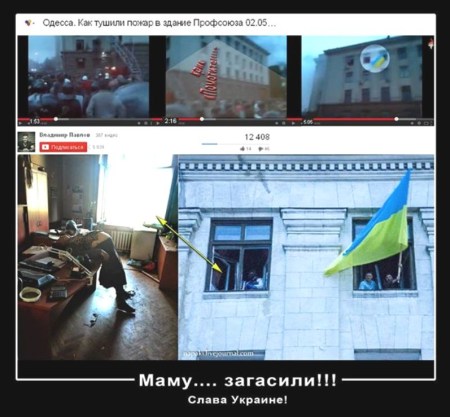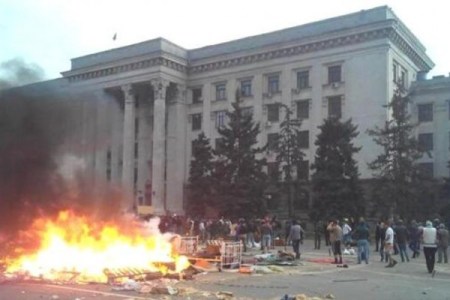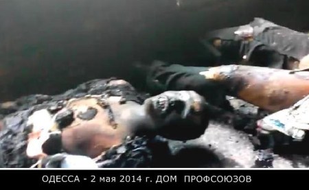 La grande tragedia accaduta nella città di Odessa venerdì 2 maggio 2014. Sostenitori del federalismo furono inseguiti fino alla Casa del Sindacato dalla marmaglia di “PravySector – Settore Destro”. L’edificio subito dopo fu dato alle fiamme e morirono, secondo i rapporti ufficiali, 48 persone, oltra a quasi 300 feriti. È chiaro che il numero delle vittime nella Casa del Sindacato è di gran lunga più elevato. I provocatori intrappolarono le persone all’interno dell’edificio dove era possibile ammazzarle impunemente, con grande piacere e senza testimoni. Il fuoco all’interno dell’edificio fu appiccato allo scopo di coprire l’assassinio di massa di cittadini ucraini.