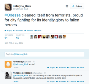 Olesya Orobets, vice presidente del Partito di Svoboda: “E ‘una giornata storica per l’Ucraina, sono così felice che questi separatisti fastidiosi a Odessa sono stati finalmente liquidati.”