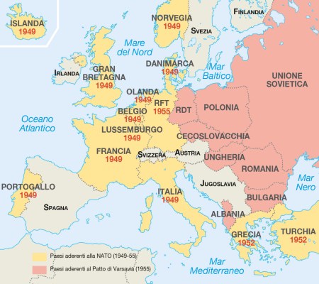 La divisione dell’Europa in due aree di influenza delineata alla conferenza di Yalta nel febbraio del 1945, a seguito dell’inasprirsi dei rapporti fra le due superpotenze nei primi anni del Dopoguerra, portò alla cosiddetta Guerra Fredda, alla corsa al riarmoe alla contrapposizione frontale anche strategico-militare tra i due blocchi. Il 9 aprile 1949 venne, infatti, fondata, su proposta statunitense, la Nato (Organizzazione del Trattato dell’Atlantico del Nord) da 12 Paesi (Belgio, Canada, Danimarca, Francia, Islanda, Italia, Lussemburgo, Norvegia, Paesi Bassi, Portogallo, Regno Unito e Stati Uniti) con l’obiettivo di controbilanciare il potere dell’Unione Sovieticae dei suoi paesi satelliti in Europa. Il proposito era di creare una sorta di deterrente contro eventuali velleità espansionistiche dell’URSS. Dall’altro lato, il 14 maggio 1955, Urss, Albania (uscita nel ‘68 ), Bulgaria, Ungheria, Cecoslovacchia, Germania Est, Polonia e Romania firmarono a Varsavia il Trattato di amicizia, cooperazione e assistenza reciproca, noto in seguito come Patto di Varsavia, un’alleanza militare che aveva a sua volta lo scopo di fare da deterrente all’espansionismo Usa, in risposta all’ingresso della Germania Ovest nella Nato il 9 maggio 1955.
