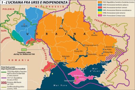 Dopo l’abbattimento dell’impero zarista, al termine della I Guerra mondiale coesistevano addirittura due Ucraine: la Repubblica Popolare dell’Ucraina Occidentale e Transcarpazia (1918, linea verde nella carta 2) e la Repubblica Ucraina di Kiev (1917-21, linea viola), inserite entrambe in modo grossolano nel più vasto spazio etno-linguistico ucraino (linea tratteggiata). Nel 1922 una versione ridotta di quest’ultima divenne la Repubblica Socialista Sovietica Ucraina (arancione), cui nel 1924 la Russia sottrasse la fascia di territorio che congiunge le alture del Don al Mar d’Azov (strisce rosa e marroni).