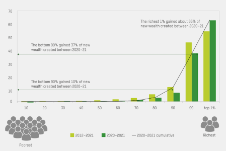 Grafico 1: quote di nuova ricchezza acquisita dal 1% più ricco e dai restanti 99% e 90% , confronto 2012-2021 (colonna verde chiaro) e 2020-2021 (colonna verde scuro). Fonte: Oxfam su dati Credit Suisse