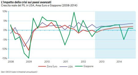 Grafico 2: variazione annua del Pil nell’Eurozona, negli Usa e in Giappone fra 2008 e 2015. Fonte: Ocse