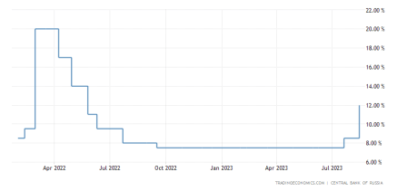Grafico 2: andamento dei tassi interesse della Banca Centrale russa fra marzo 2022 e agosto 2023