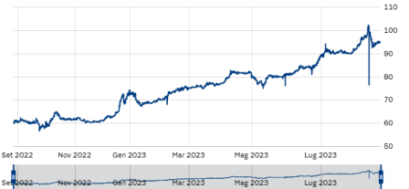 Grafico 4: quotazione rublo in dollari fra settembre 2022 e agosto 2023
