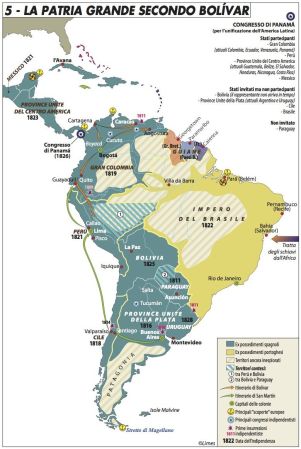 Dopo 3 secoli di dominazione coloniale europea, all’inizio del XIX sec. le aspirazioni indipendentiste, incarnate dalla figura di Simon Bolivar “El libertador”, sorte nelle colonie del subcontinente, incontrando la prevedibile opposizione delle relative madrepatrie (Spagna e Portogallo, in primis), sfociarono, per l’ex impero spagnolo, in una serie di guerre combattute fra il 1808 e il 1833, sotto la guida militare delle stesso Bolivar e di Josè di San Martin in Sud America e di Miguel Hidalgo in Messico, il cui esito portò alla liberazione dal giogo coloniale (carta 3).