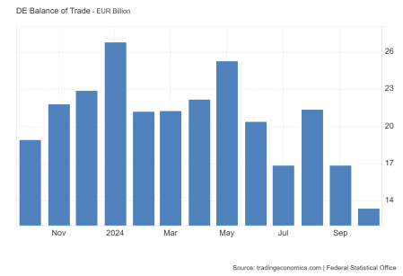 Conseguentemente anche lo strutturalmente attivo saldo commerciale mensile tedesco, a settembre e ottobre ha subito una marcata flessione, scendendo in quest’ultimo mese a soli +13,4 miliardi di euro, dal già preoccupante, +16,9 miliardi del mese precedente.