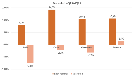 Grafico 4: tasso di variazione dei salari nominali e reali fra il 4° trimestre 2019 e il 4° del 20227