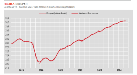 Ormai da alcuni anni nel nostro paese, al netto della contingente flessione pandemica, il numero di lavoratori e lavoratrici ufficialmente occupati risulta caratterizzato da un trend crescente che a dicembre 2024, in base ai dati dell’Istat, ha raggiunto l’entità totale di 24.065.000 con una dinamica che evidenzia un incremento di 274.000 unità rispetto al corrispondente mese dell’anno precedente1 (grafico 1).
