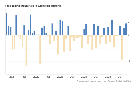 Grafico 1: variazione mensile della produzione industriale tedesca su base tendenziale da ottobre 2020 a ottobre 2025. Fonte Destasis