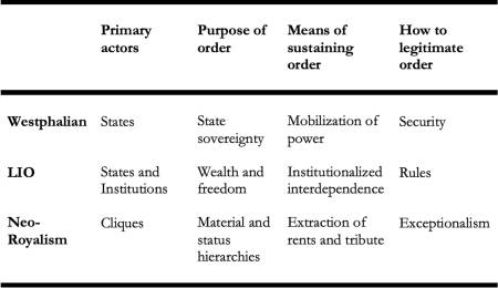 Nel modello neo-monarchico, quest’ultima non si basa sulle garanzie di sicurezza (come nel modello di Westfalia), tantomeno sul consolidamento di benessere e libertà individuali (come nel modello liberale internazionale). Bensì, sull’affermazione dell’eccezionalità del sovrano.
