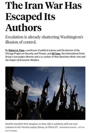 Il punto di fondo è semplice ma decisivo: la superiorità nell’escalation non coincide con il controllo dell’escalation. Si possono vincere i singoli scambi di forza e perdere comunque il controllo della traiettoria generale della guerra. È questa, secondo Pape e Vaez, la vera illusione che oggi sta guidando Washington: credere che ogni gradino successivo funzionerà come il precedente, quando invece ogni gradino rende più difficile tornare indietro. Se non si apre rapidamente uno spazio serio per un cessate il fuoco che affronti deterrenza, sanzioni, sovranità e questione nucleare in termini reali e non propagandistici, la guerra rischia quindi di estendersi per mesi, con costi sempre meno reversibili e con incentivi crescenti, per attori regionali e non solo, ad allargarla ulteriormente.