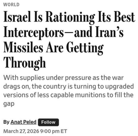 Israel Is Rationing Its Best Interceptors—and Iran’s Missiles Are Getting Through – WSJ https://share.google/qBOCDvHnqUqBy6j0Y