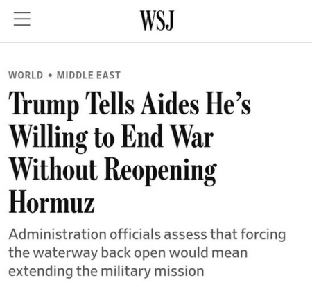 Trump Tells Aides He’s Willing to End War Without Reopening Strait of Hormuz – WSJ https://share.google/BDFIiwW22kdQ2rgLL